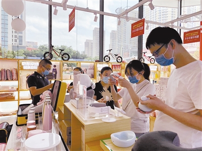 “五一”黄金周期间,龙岩各商家通过补贴现金券、与银联合作等模式,推出优惠让利活动,吸引了众多消费者前往购物,提振复商复市信心。图为5日中午,市民正在龙岩京华购物中心京东之家店内购物。