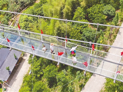 新罗区小池镇培斜村今年重新开放前进行景区道路白改黑、增设停车位和出入口体温监测等设施完善,重新开放后做到疫情防控和迎客并举,乡村休闲游逐渐升温,“五一”假期共接待游客12000人。图为5日游客在该村网红玻璃桥上游玩。