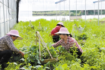 昨日,工人在永定龙潭镇深山百农生态公司移栽包菜苗。2016年,龙潭镇引进该项目,目前项目共承包轮转土地163亩,建设蔬菜大棚30亩。今年来,大棚内和露天基地共种植了12个品种的农作物,可为当地提供约20个就业岗位。