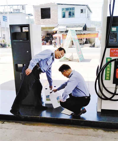 连日来,连城县市场监管局朋口市场监管所执法人员,深入辖区开展柴油货车污染治理攻坚战行动,重点对清洁柴油车、清洁柴油机、清洁运输和清洁油品等项进行执法检查,保障消费安全和消费者合法权益。图为执法人员日前在一家加油站执法检查。