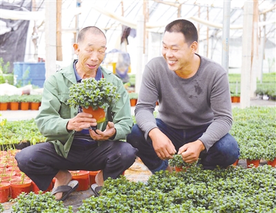 革命基点村漳平市永福镇龙车村将产业发展与脱贫攻坚深度结合,近年来将全村38户贫困户全覆盖入股光伏发电,在村部、村小学屋顶上安装800平方米光伏发电设施,总装机容量130千瓦,扶贫户每年可增加收入约8000元左右,同时扶持贫困户参与花卉种植,从源头解决了贫困户增收难的问题。图为5月20日该村眼睛残疾的贫困户陈水火在花卉大户的帮扶下种植蟹爪兰。记者 傅长盛 摄