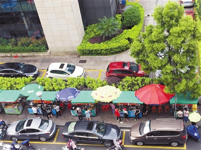 6月2日早晨,位于商务板块新罗区交通局门口的路边摊。这些路边摊由政府提供统一的摊车,个体摊主都自觉做到有序经营,不仅为商务板块的职员及周边小区居民提供了品种丰富的早餐,也使经营者有了较稳定的收入来源。