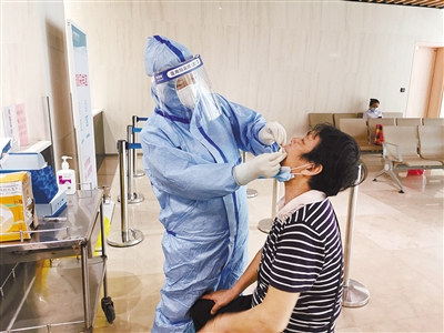 根据国家、省、市疫情防控工作部署,龙岩市第一医院将病毒核酸检测纳入入院前筛查项目。所有住院患者(含日间病房)及其陪护人员(限1名)在办理入院前,应先进行免费病毒核酸检测(除急危重症患者、儿科、新生儿科入院患者),待检测报告出具且结果为阴性后,方可办理入院手续。图为医护人员为病人采集咽拭子。