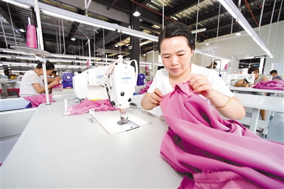 6月14日,工人在天柱县易地扶贫搬迁集中安置点的一家服装生产企业加工女装。贵州省黔东南苗族侗族自治州天柱县在易地扶贫搬迁集中安置点引进企业,打造“扶贫工厂”,确保搬迁群众就业增收。截至目前,天柱县共引进包括服装生产、油茶深加工、医药健康等类型的企业32家,吸纳1200余名易地扶贫搬迁群众家门口就业。