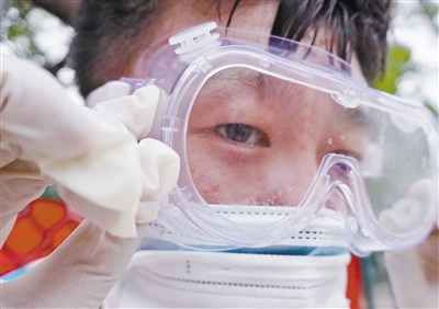 丰台区东高地街道社区卫生服务中心一位医护人员的护目镜内流进了汗水(6月15日摄)。连日来,北京出现高温天气。酷暑中,工作人员坚守抗击疫情一线,成为烈日下的“逆行者”。