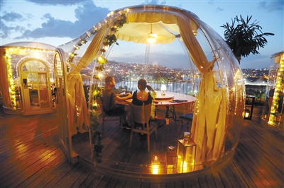 6月16日,人们在土耳其伊斯坦布尔一家餐厅露台区的透明钟型就餐防护罩内用餐。近日,位于土耳其伊斯坦布尔市区金角湾畔的一家餐厅推出透明钟型就餐防护罩,为顾客提供卫生安全保护。这些装有透明钟型就餐防护罩的餐位需要提前预约,餐厅会在顾客到来前进行彻底的消毒,餐厅还在防护罩里面放置了洗手液等设施。目前这家餐厅在露台区共安置了8个透明钟型就餐防护罩。 新华社发(奥斯曼·厄尔萨尔摄)