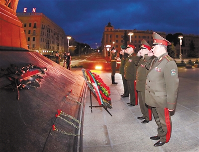 6月22日凌晨,军人们在白俄罗斯首都明斯克市中心的胜利纪念碑前敬礼。白俄罗斯22日举办活动纪念卫国战争牺牲者。1941年6月22日,德国法西斯军队对白俄罗斯布列斯特要塞发动进攻,苏联卫国战争爆发。
