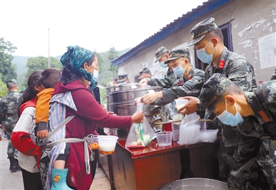 6月29日,武警四川总队凉山支队官兵在冕宁县大马乌村安置点为群众发放早餐。