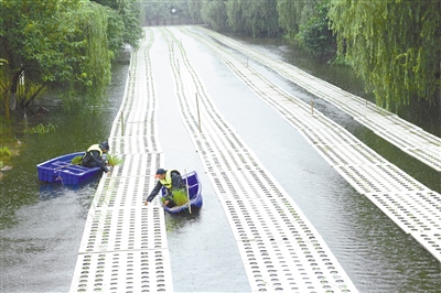6月29日,工作人员在吴兴区湖东街道的“水上稻田”插秧。今年以来,浙江湖州吴兴区湖东街道开始在辖区河道大规模推广“水上稻田”新型农业项目,利用浮岛进行特种水稻种植,既能净化水体,又能产出生态稻谷。“水上稻田”预计在11月实现收割。