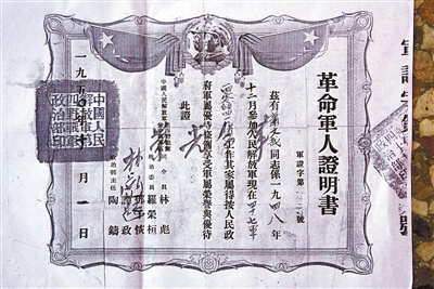 图为一九五O年四野颁发给肖文占的革命军人证书。