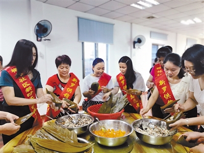 连日来,新罗区中城街道梅林社区联合新时代文明实践站、区供销社、社区志愿者开展“片片粽叶香 浓浓端午情”系列活动,活动有制作驱蚊香包、包粽子、慰问辖区困难群众。活动吸引了辖区居民、社区党员共计60多人参加。随后,社区工作人员将煮好的粽子送到辖区困难老党员、困难家庭、孤寡老人等对象手中,给他们送去节日的温暖和社区大家庭的浓浓关爱。图为正在包粽子。