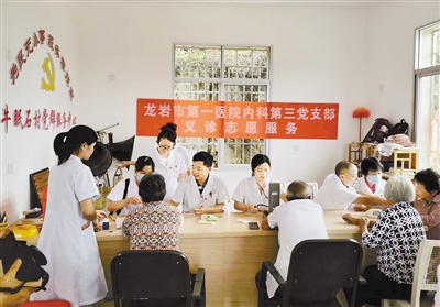 “七一”前夕,市第一医院内科第三党支部前往新罗区小池镇牛眠石村举行“忆初心、讲党性、记使命、献爱心”主题活动,18名党员为村民开展义诊服务,并看望慰问98岁的老交通员吴浩宽。图为党员们为村民义诊的场景。