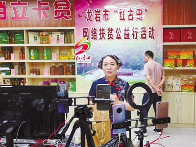 今年3月,长汀县设立长汀供销电商扶贫农产品展销服务中心,展出全县17个乡镇38类扶贫农副产品,带动贫困户和扶贫企业农副产品销售。图为近日该中心工作人员在进行网络直播带货的场景。