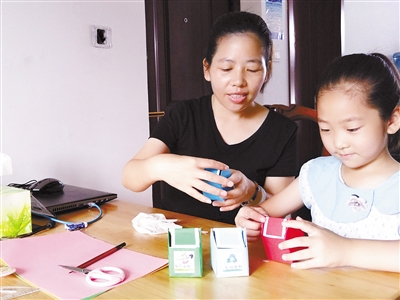 连日来,新罗区东肖镇联合龙岩学院附属小学,利用暑假组织学生在家开展“我和爸爸妈妈齐动手”家庭垃圾分类活动,进一步增强学生及家长的垃圾分类意识。图为一学生和家长在自制垃圾分类桶。