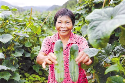 上杭县白砂镇在碧沙村连片建设22亩蔬菜基地,实施碧沙片4个村19户贫困户扶贫项目,由镇种植大户李贵统一技术、销售,让贫困户通过基地务工和收益分红脱贫。图为基地贫困户在喜收黄瓜。