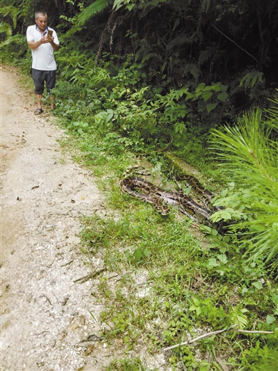 近日,一条重28千克、长4米多的蟒蛇闯入武平中堡镇某鸡场,场主把它送至500米外的大山脚下放生,他的行为得到村民们的点赞。