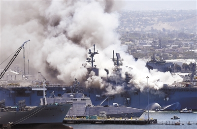 7月12日,美国加利福尼亚州圣迭戈海军基地起火冒出浓烟。停泊在加利福尼亚州圣迭戈海军基地的一艘美军两栖攻击舰12日发生火灾,造成包括17名海军士兵在内的21人受伤。