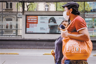 7月12日,人们走过墨西哥首都墨西哥城一面政府设立的防疫宣传展板。墨西哥卫生部12日发布的数据显示,过去24小时墨西哥新增新冠确诊病例4482例,累计确诊299750例;新增死亡病例276例,累计死亡35006例。