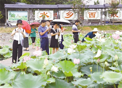 永定区高陂镇西陂村围绕全国文物保护单位西陂天后宫,做好美丽乡村建设,实施乡村振兴,投入资金在西陂天后宫前种植38亩荷花,盛夏时节荷花开放,古塔荷花相辉映,吸引大批游人前来游览。图为日前该区的党员干部来西陂村开展主题党员活动参观荷塘景色。 记者 傅长盛 摄