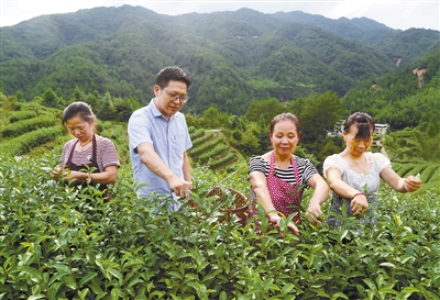 近日,张元豪与聘请的茶农一起采茶。记者 曾志明 摄