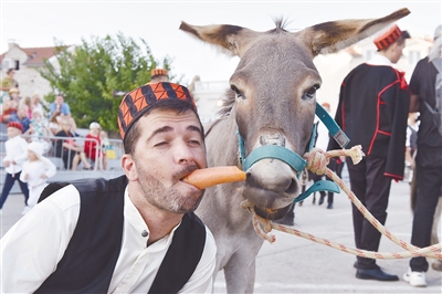8月29日,在克罗地亚西南部沿海地区的特里布尼耶村,一名参加骑毛驴比赛的骑手与他的坐骑分享胡萝卜。克罗地亚沿海的这个小村子有举办骑毛驴比赛的传统。这项赛事起源于上世纪50年代,每年都会吸引大批游客,今年的比赛受疫情影响从8月初推迟到了月底。
