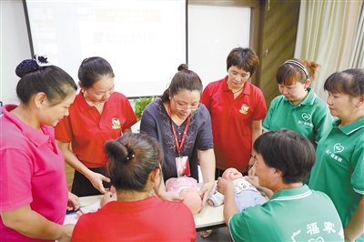 红妹子(福建)家政服务股份有限公司积极开展月嫂、保姆、保洁、家电维修等多项技能培训,帮助劳动者增强就业能力。图为母婴护理培训。