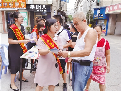 9月4日,新罗区西城街道苏溪社区联合共建单位市委编办、棉花滩水电开发公司、区土地收储中心等市区共建单位共100多人,开展“共驻共建同携手,文明创城聚合力”主题志愿服务活动,共发放创城各类宣传材料3000余份,处置杂物堆放5处,整治共享单车乱停放6处。图为志愿者向过往群众宣传的场景。