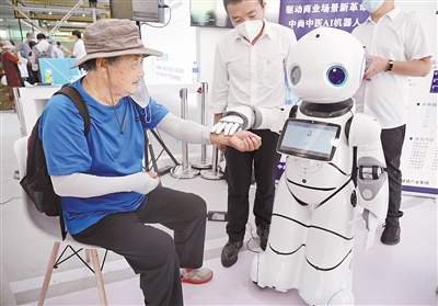 9月7日,在服贸会服务机器人专题展区,一款中医AI机器人为观众把脉。这家企业的中医AI机器人可通过中医诊断方式与人交互,并提供体质检测、健康咨询等服务。