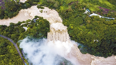 受强降雨影响,贵州黄果树瀑布迎来2020年入汛以来最大水量,黄果树瀑布水势磅礴。(人民网)