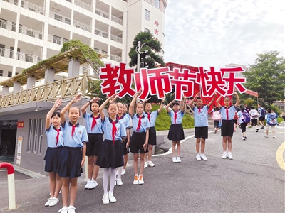 昨日上午,龙岩市松涛小学的少先队员在校门口迎接老师,向老师行队礼并送上节日祝福。