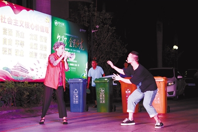 11日晚,由“携手同心 共创文明”新罗区红色文艺轻骑兵进社区文艺演出走进曹溪街道天马社区厦鑫瑞锦小区。活动除了精彩的演出外,还设置了观众互动有奖竞答环节,既宣传了创城知识,又拉近了创城与群众的距离。图为小品《垃圾分类好处多》演出场景。 通讯员 温连光 杨晶 摄