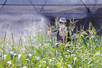 9月12日,工人在淮北市渠沟镇一生态观光田园综合体管护玉米。近年来,安徽省淮北市相山区渠沟镇在推动农业产业结构升级过程中,依托当地资源条件和产业基础,引入农业企业,打造集农业、休闲、旅游、体验等为一体的田园综合体,带动农民就业增收致富,助力乡村振兴。