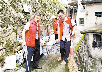 东城街道东风社区志愿者正在开展社区环境卫生整治。