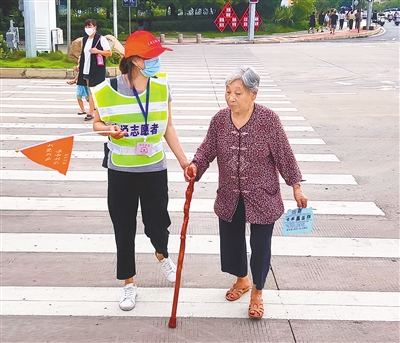 志愿者在莲庄路红绿灯处扶老人过马路。