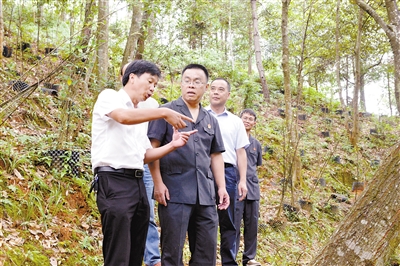 9月10日,长汀县人民法院法官来到红军入闽第一村、省级扶贫开发重点村长汀县四都镇上焦村,结合发展林下经济所需的法律知识,开展上门送法活动,帮助农户防范法律风险,司法服务助力脱贫攻坚。图为法官在村民承包山场释法。