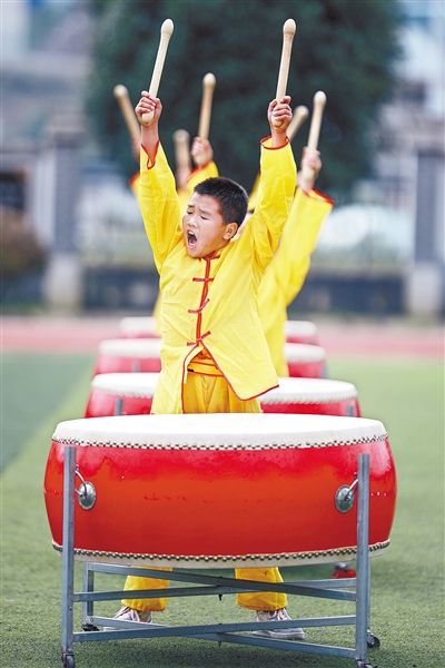 滚铁环、敲锣鼓、踩高跷、走板鞋……这些70后、80后们的儿时游戏,是贵州省遵义市余庆县敖溪小学孩子们体育课上的最爱。从2012年开始,敖溪小学就将这些特色内容编入了体育教学之中,还通过组织课外培训、小型亲子比赛等活动进行推广。图为敖溪小学学生在体育课上练习威风锣鼓。