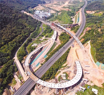 龙岩东环高速公路富溪互通,自2018年10月动工以来进展顺利,在今年1月实现C匝道顺利合龙的基础上,8月份又实现A匝道2号桥钢箱梁顺利合龙,整个互通基本成型,项目有望于2021年底建成通车。图为昨日施工中的东环高速富溪互通鸟瞰。 记者 傅长盛 摄