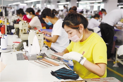 长汀安踏体育用品有限公司关爱残疾人,积极为他们提供就业岗位,目前有21名残疾人在该公司上班。图为近日手部残疾的员工上班情景。