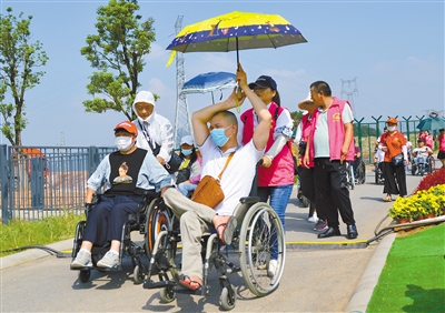10月4日,龙岩爱心公益、龙岩义工、紫金山体育公园和龙岩希望之家联合举办“秋之韵”助脊髓损伤轮友赏菊公益活动,为来自新罗及周边共40余位轮友全程协助赏菊游览。图为烈日下轮友为志愿者撑伞遮荫的温馨场景。