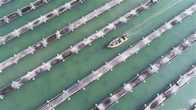 10月28日,工人在山东省荣成市天海湾海洋牧场捕捞海参(无人机照片)。目前正是秋海参捕捞时节,山东省荣成市的海参养殖企业和养殖户们每天都忙着捕捞海参供应各地市场。近年来,荣成市海参养殖迅猛发展,已成为当地渔业增效、渔民增收的支柱产业之一。 新华社发