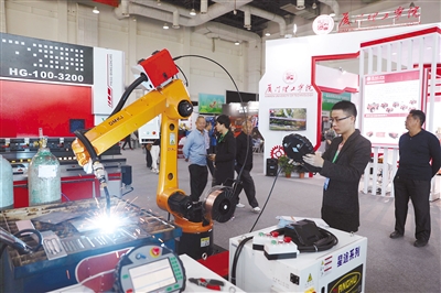 昨日,在第十一届海峡两岸机械产业博览会暨第十三届中国龙岩投资项目洽谈会上,参展商在展馆演示操作焊接机器人进行氩弧焊。