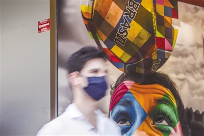 11月8日,巴西圣保罗市一名戴口罩的男子经过一处写有“巴西”字样的艺术作品。