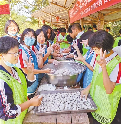 长汀县河田镇一家农场利用现有大片种植养殖基地,与县有关部门合作研学,入秋以来该农场举行了共640名中学生的劳动研学活动,让孩子们体验农场河田鸡特色文化、农耕文化、河田美食文化,体验劳作艰辛,传承客家文化,培养集体主义精神。图为日前河田中学280名学生在农场进行客家美食烹饪活动。
