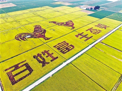 长汀县实施的“2020年农业部水稻绿色高质高产高效创建万亩示范田”晚稻喜获丰收,正进入机械化收割。该示范片包括昔日水土流失严重的上街、南塘等村,总共11500亩,选用优质稻,采用工厂化育秧、全程机械化耕作、测土配方施肥、绿色防控病虫害等技术,晚稻有望达到每亩480公斤产量目标。图为昨日示范片五彩稻图案,呈现一片“百姓富生态美”的乡村振兴图景。