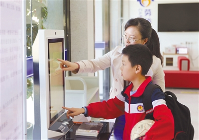 连城县以创建省级文明县城活动为契机,投入六百多万元在城区建设五个冠豸书屋,于二○二○年十月正式投入使用。图为十六日,工作人员在教刚放学的小学生用智能借书系统借阅图书。 记者 郭亦斌 通讯员 黄水林 摄