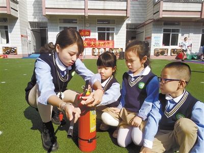 新罗区中城街道梅林社区联合该街道安监站开展“消防进社区 大手拉小手”主题活动,到辖区内的新罗区梅林幼儿园开展消防演练、消防知识讲解。图为幼儿园的师生们在学习使用灭火器时的情景。