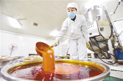 12月3日,工人在麻江县一食品公司生产车间搅拌制作酸汤粉的原料。近年来,贵州黔东南苗族侗族自治州麻江县传统酸汤企业,通过产品创新推出速食预包装酸汤粉产品,实现了地方街头小吃的工业化生产。创新发展不仅为当地新增了就业岗位,“公司+合作社+农户”的模式还带动周边群众发展辣椒、西红柿、生姜种植,助力群众增收。