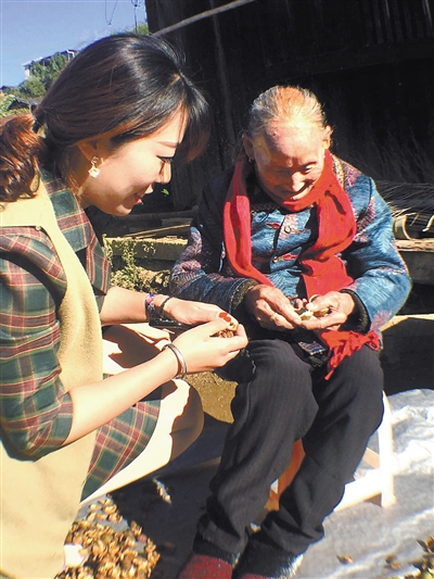 老人和曾孙女一起剥油菜籽。