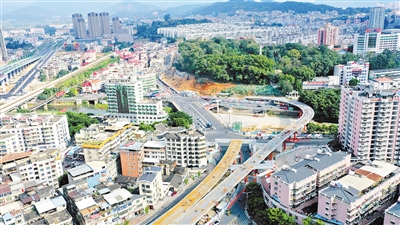龙岩市城建“重中之重”项目——中心城区罗桥节点改造提升工程,总投资约3.18亿元,沿北环西路、龙兴路设置南北分离式双向四车道高架,南侧接龙兴路,北侧接现有北环西路;在双洋路、龙川北路、北环西路设置人行天桥,与山体步道衔接,以完善慢行系统;在烈士陵园山体下采用明挖回填方式。项目计划于2021年6月完工通车,建成后将进一步均衡城区路网交通流、改善城市道路通行条件。图为记者2日航拍施工中的场景。