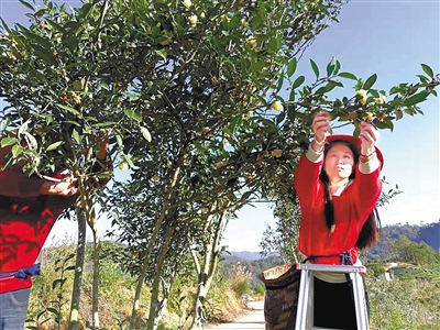 图为工人在漳平水仙茶老茶树上采摘茶花。